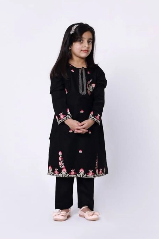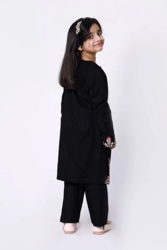 Elevate your girl’s winter wardrobe with this Black Khadar Embroidered Suit. Crafted from soft and warm khadar fabric, it features elegant embroidery, making it perfect for special occasions and casual outings.