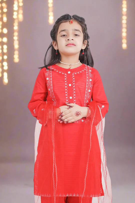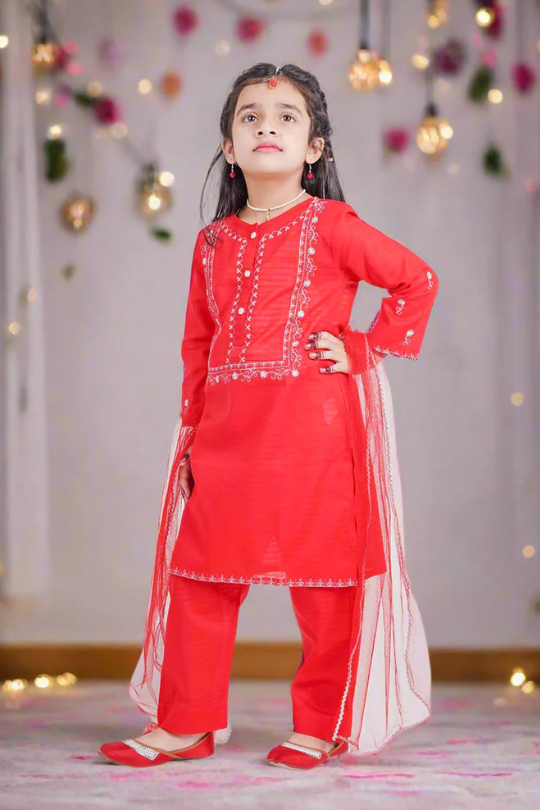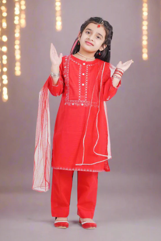 Dress your little one in this stunning Embroidered Red Trouser Set, perfect for festive and formal occasions. The intricate white embroidery on the vibrant red kurti adds a graceful touch, while the matching trousers and delicate net dupatta complete the elegant look. Comfortable, stylish, and effortlessly charming!